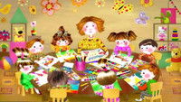 В детском саду дети рисуют картинки. Воспитательница берет по очереди их рисунки и спрашивает, как кричит петушок, рычит тигр… Дети охотно отвечают. На очередном рисунке воспитательница смущенно замолкает, задав воспрос: «Как кричит крокодил?» Одна девочка неожиданно отвечает: «Мяу-мяу», потому что, по ее мнению, крокодил проглотил ее кошечку на рисунке. И начинается веселая песня-игра.